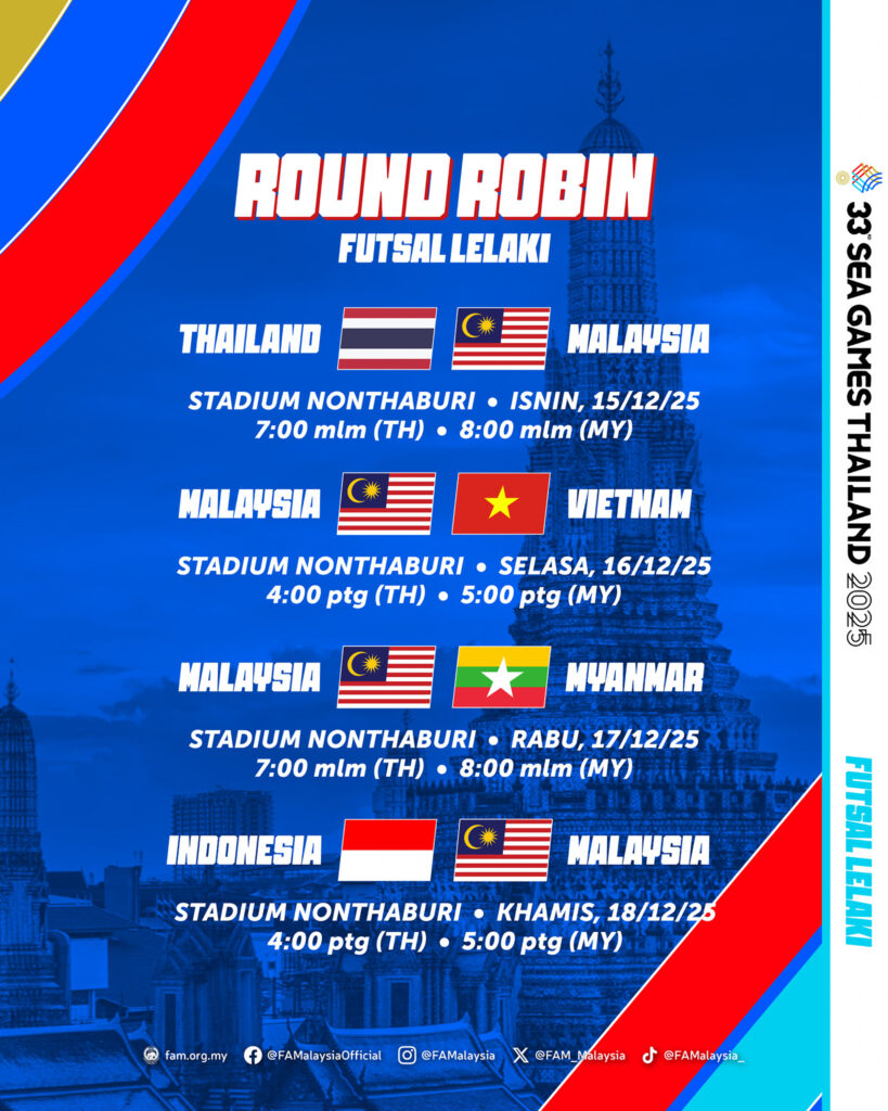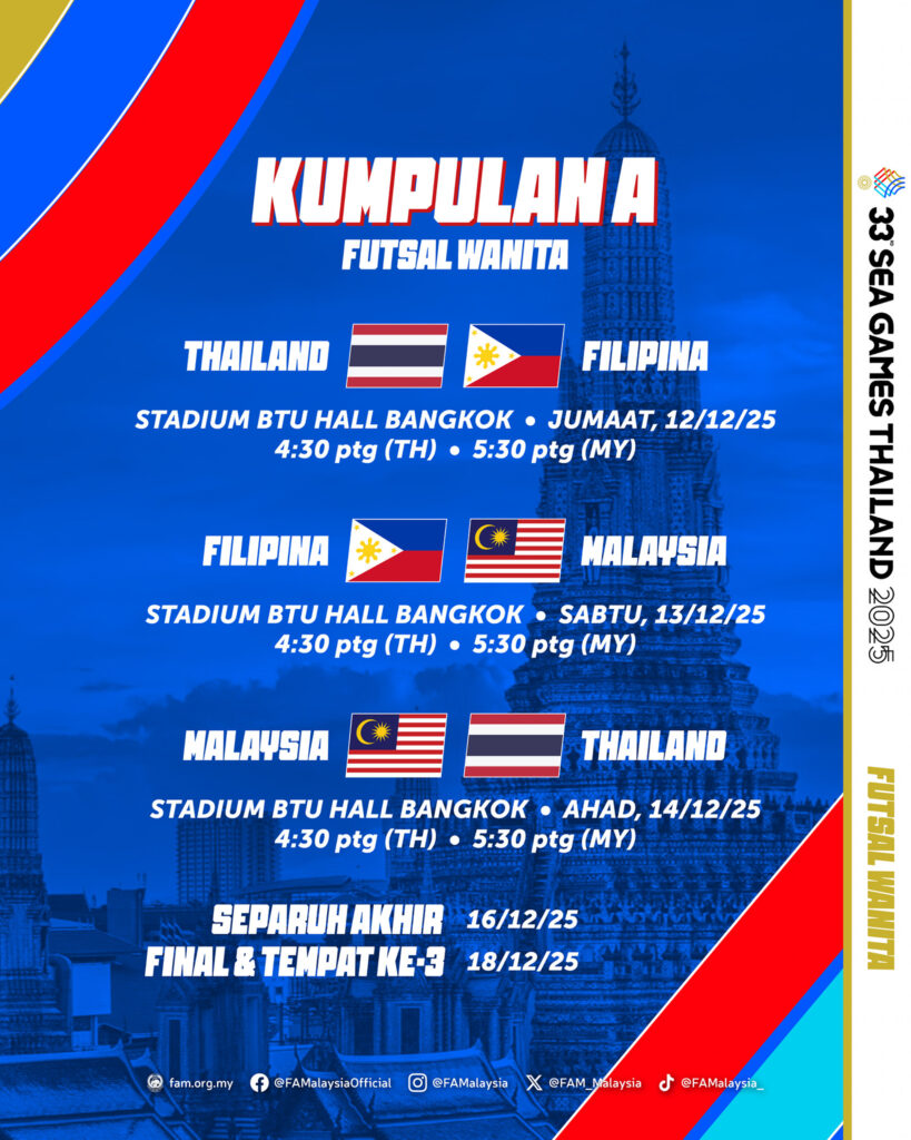 Sukan SEA Thailand 2025 bakal membuka tirai dengan aksi futsal yang menjadi antara tumpuan utama temasya, dan Malaysia hadir dengan misi besar dalam kedua-dua kategori futsal wanita dan futsal lelaki. Poster rasmi yang dikeluarkan memperlihatkan rangkaian perlawanan yang akan berlangsung di dua venue utama, iaitu Stadium BTU Hall Bangkok untuk pasukan wanita dan Stadium Nonthaburi untuk pasukan lelaki.